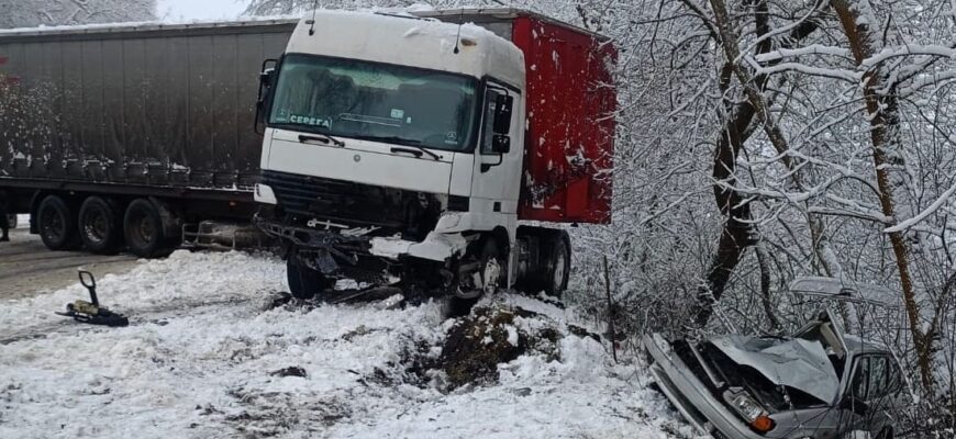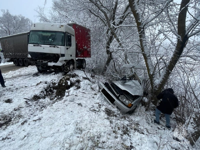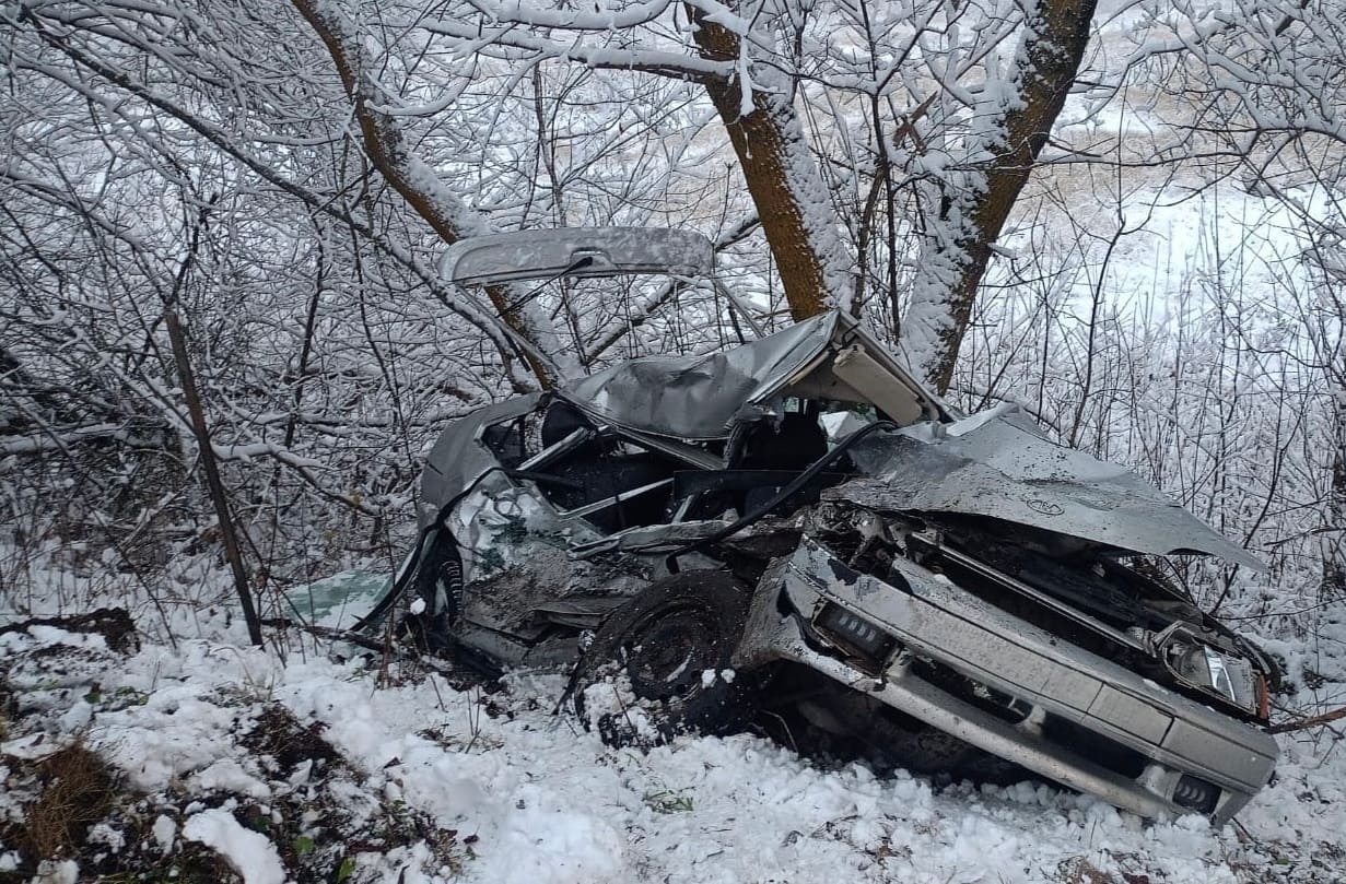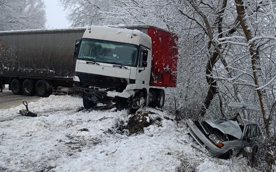 Дорожно-транспортное происшествие с отечественной легковушкой и грузовиком, случившееся на занесенной первым декабрьским снегом трассе Трубчевском и Суземкой, погубило женщину-водителя ВАЗ-21144.