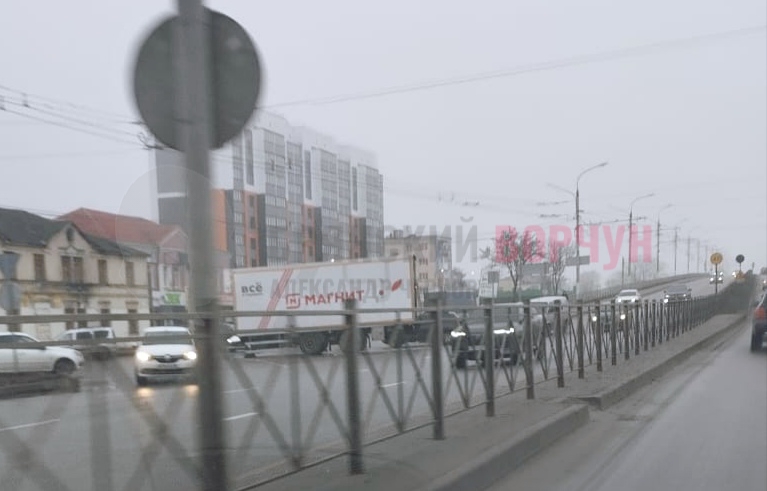 После неудачного дорожного манëвра водитель грузовика, раскрашенного в фирменные корпоративные цвета торговой сети “Магнит”, расписался в своей беспомощности. Он, похоже, не придумал ничего лучше, чем отметить и… бросить фургон-полуприцеп сразу за путепроводом – прямо посреди дороги.