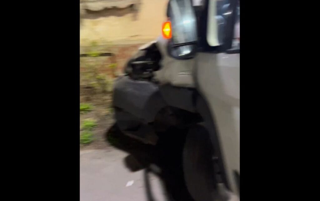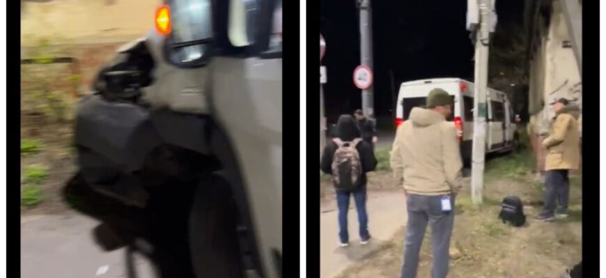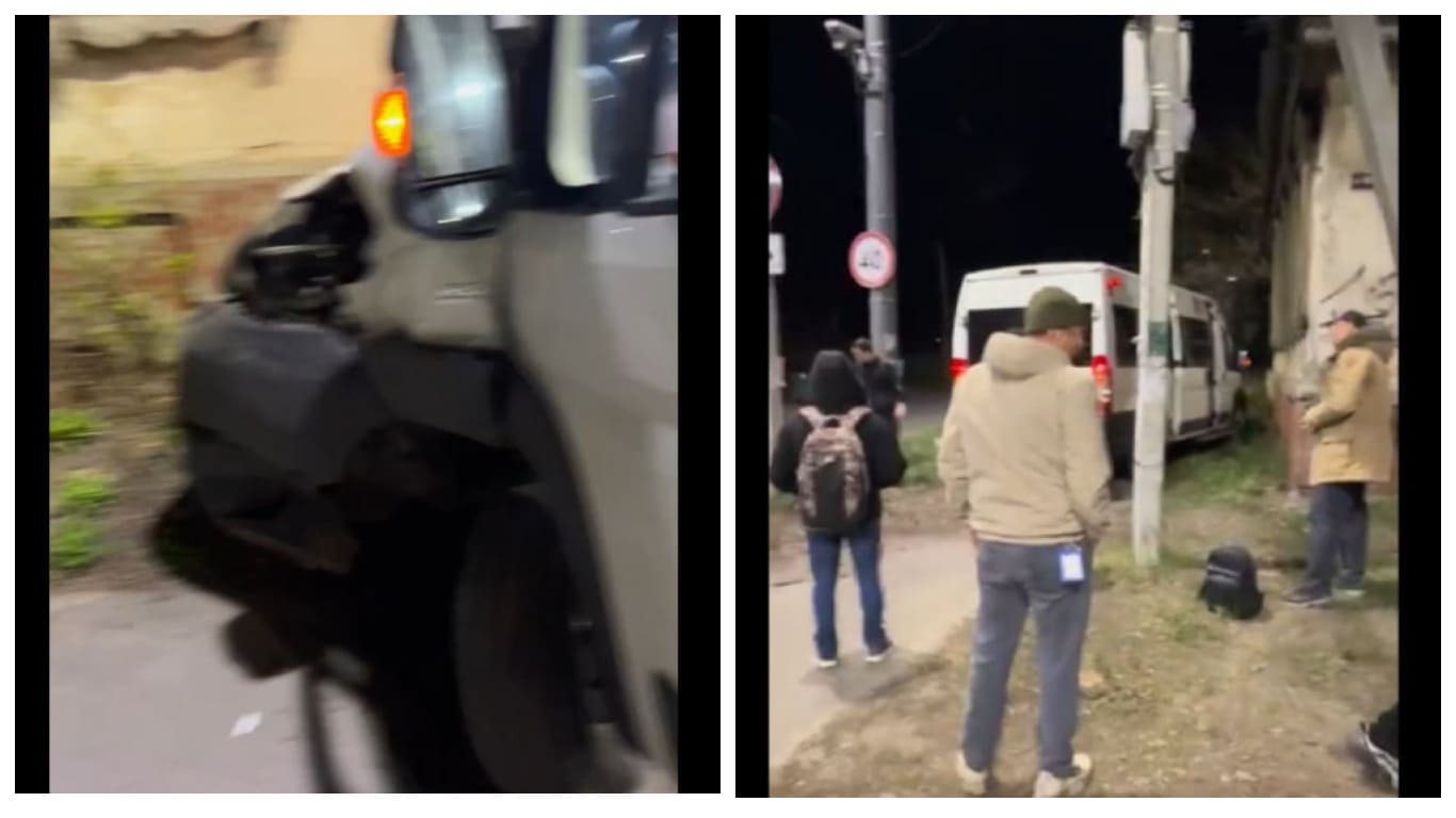 От жуткого удара пассажирский микроавтобус перескочил легко через тротуар и вылетел на тротуар, где чуть-чуть не врезался в частный дом. Маршрутка остановилась буквально в метре или чуть больше от жилого строения.