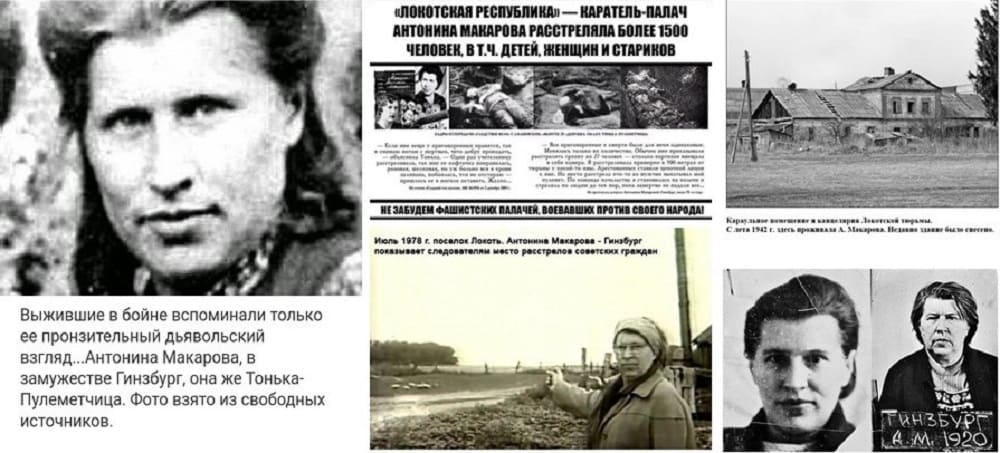 На совести Антонины Макаровой (урожденной Панфиловой, в замужестве – Гинзбург) более 1500 расстрелянных из пулемёта граждан. Уважаемая в своем белорусском городе Лепель контролёр швейной фабрики была во время Великой Отечественной войны палачом Локотской “республики”, располагавшейся на оккупированной фашистами Брянщине. Ее саму к смертной казни приговорили 20 ноября 1978 года в Брянске.