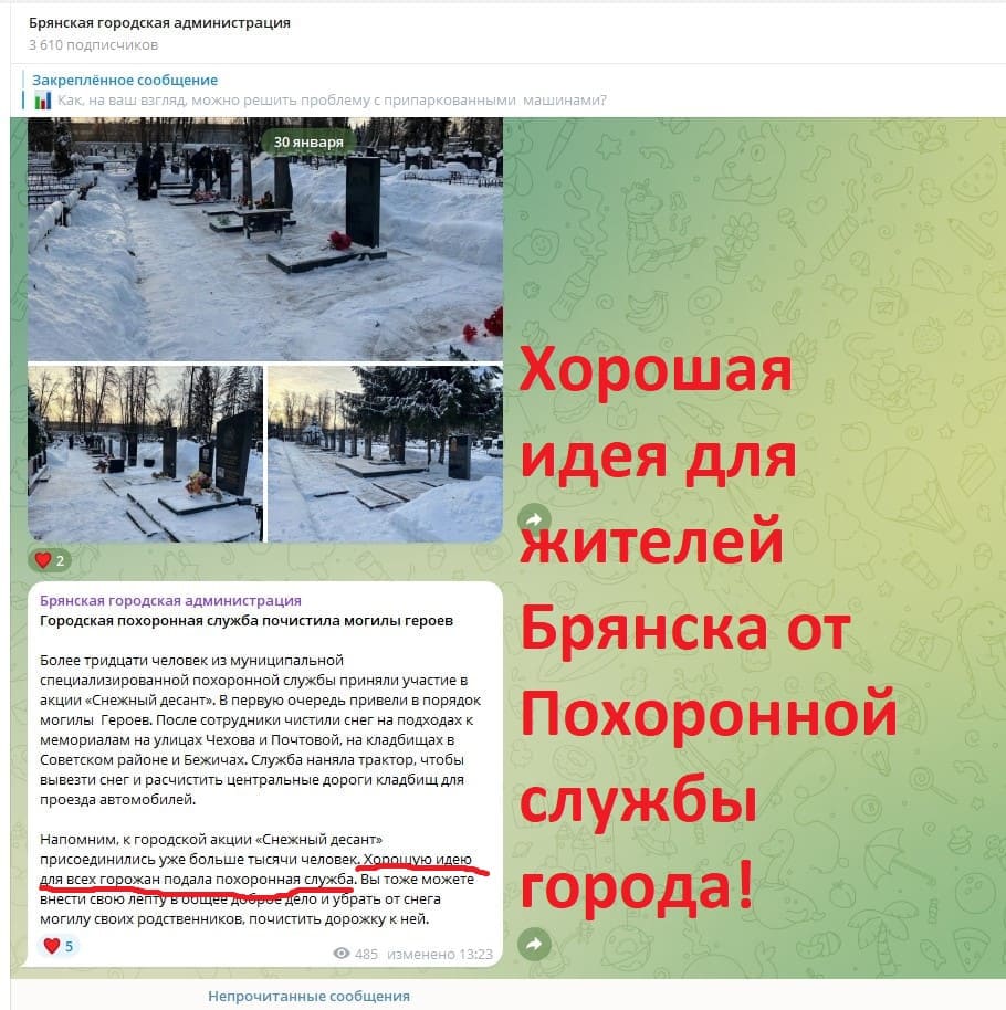 Хорошую идею для всех жителей Брянска подала Похоронная служба столицы региона. Именно так — про хорошую идею от городских гробовщиков — в официальном сообщении мэрии областного центра и сказано!