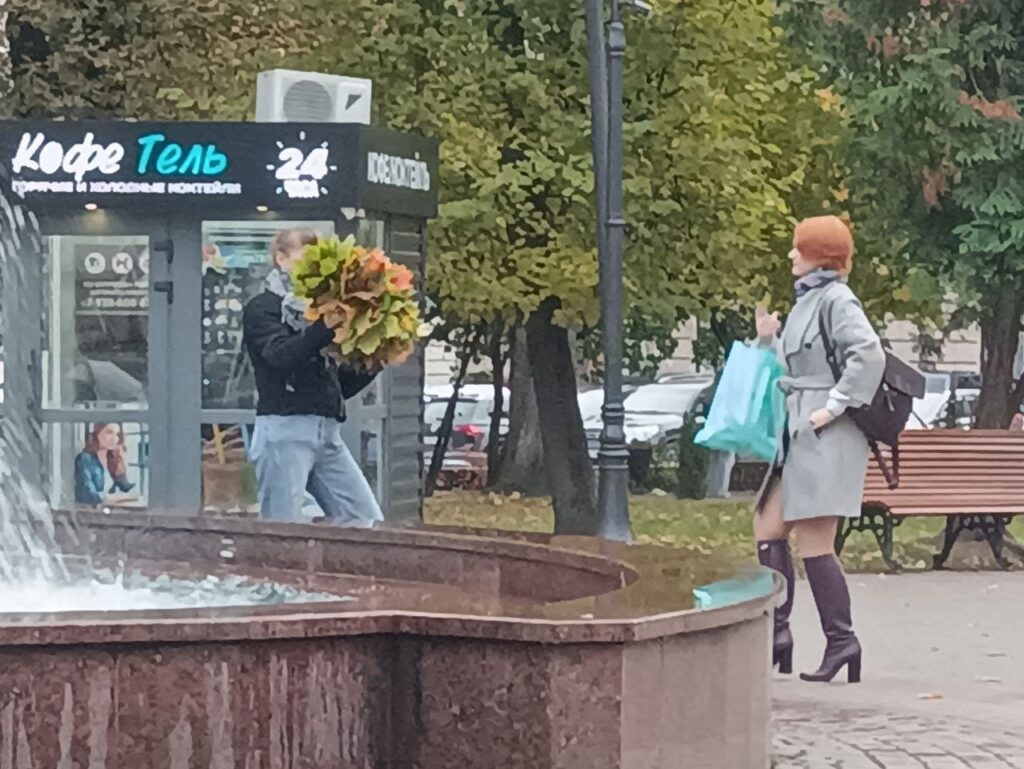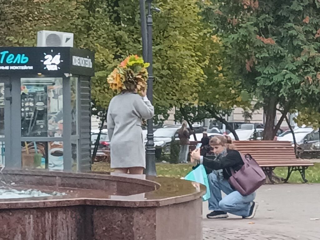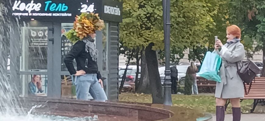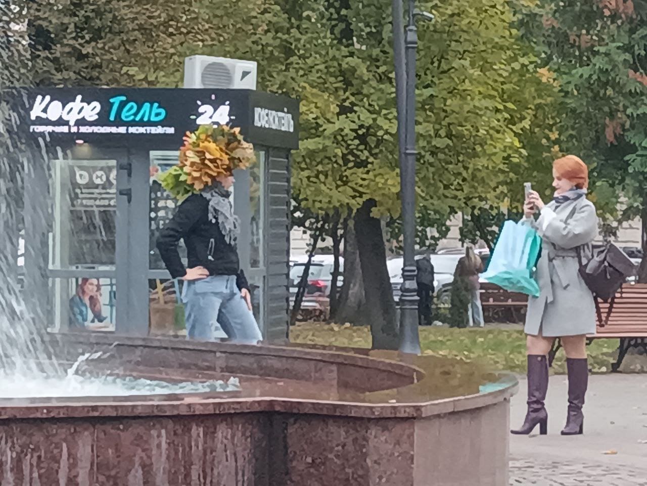 Но подружки долго в сквере не задержались. Сфотографировались поочередно с водруженным на голову огромным венком из пылающих красками осени и были таковы.