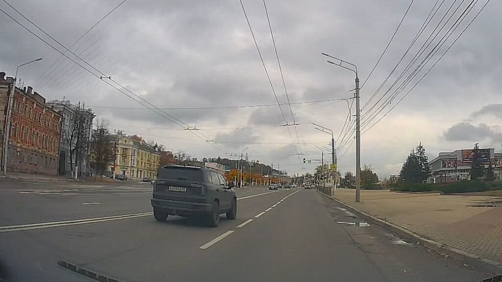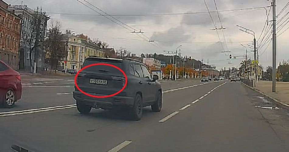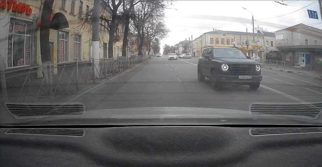 Лихой водитель-гонщик на дорогом черном внедорожнике Tank и с “крутым” госномером “555” дважды пролетел на запрещающий сигнал светофора за 8 секунд в историческом центре Брянска.
