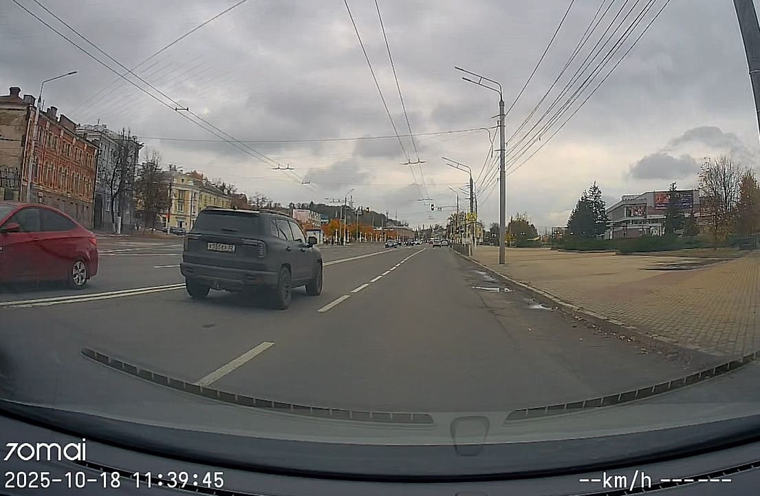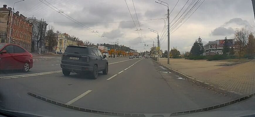 Лихой водитель-гонщик на дорогом черном внедорожнике Tank и с “крутым” госномером “555” дважды пролетел на запрещающий сигнал светофора за 8 секунд в историческом центре Брянска.