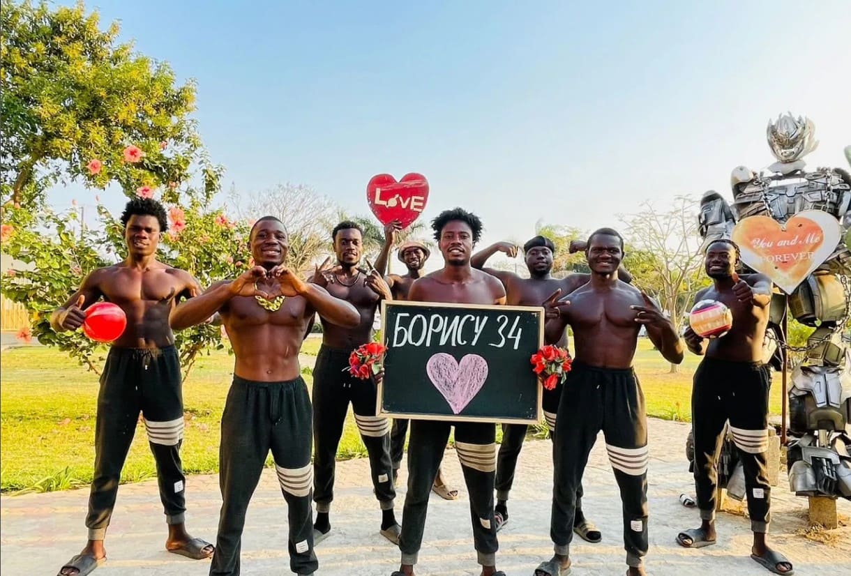 В стандартное поздравление от брянских студентов-африканцев “по лучшей цене” входят: текст поздравления на доске, его “озвучивание (команда говорит хором)”, также музыкальная феерия и… по желанию “поцелуи Ваших фотографий”. А вот фотосессию с парнями-атлетами придется оплатить отдельно.
