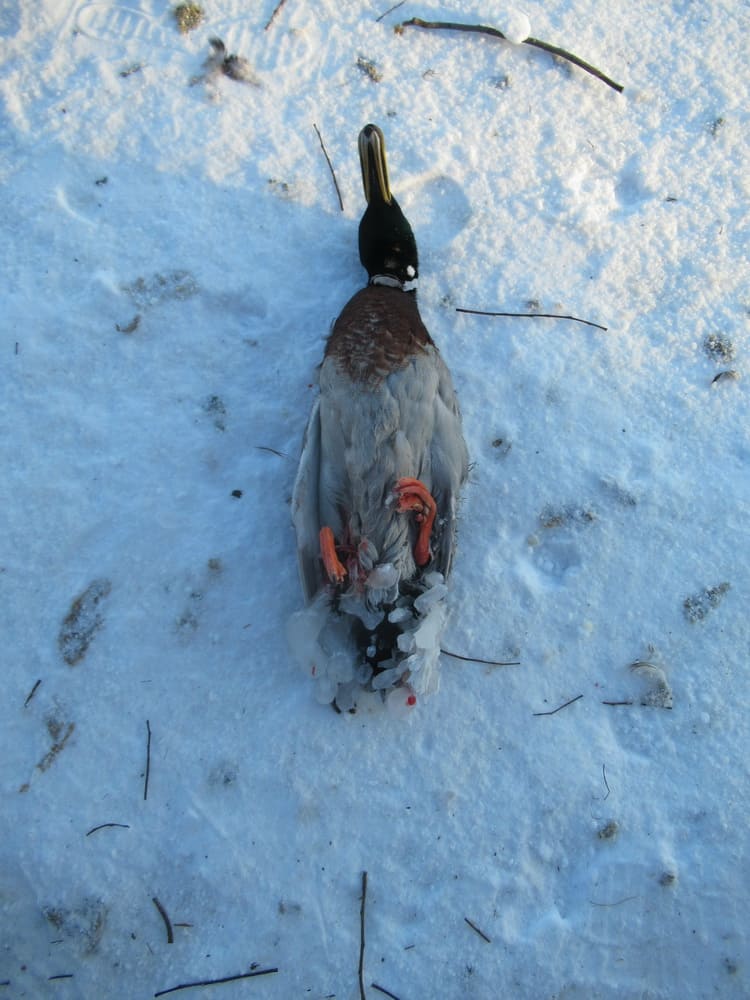 «Нужна помощь утке. Набережная, бывший причал. Самка кряквы с ледяным колпачком на клюве. Заметила её сегодня, когда кормила уток. Голодная.