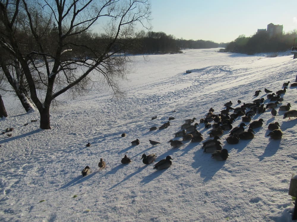 На берегу главной брянской реки было обнаружено несколько таких бедолаг. К сожалению, помочь им не удалось: при любом неосторожном движении вся огромная стая уток взлетела и переместилась в другую полынью на Десне.