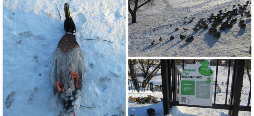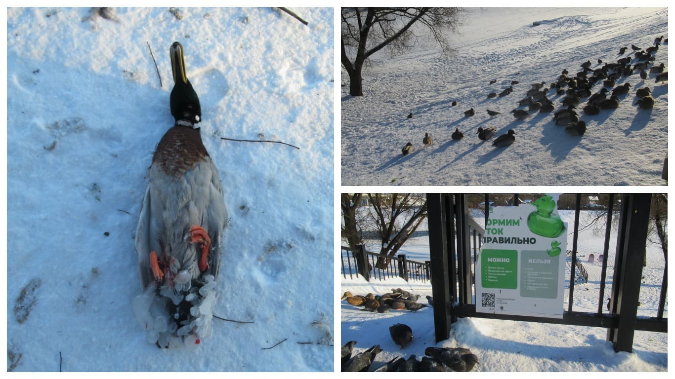 В старом центре города Брянска, на набережной реки Десны, местные волонтёры-зоозащитники обнаружили диких уток с обледенелыми клювами. Одна из них, как минимум, погибла.