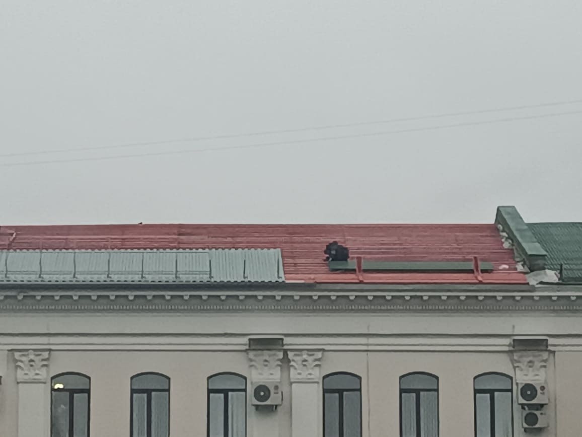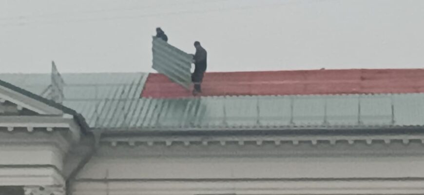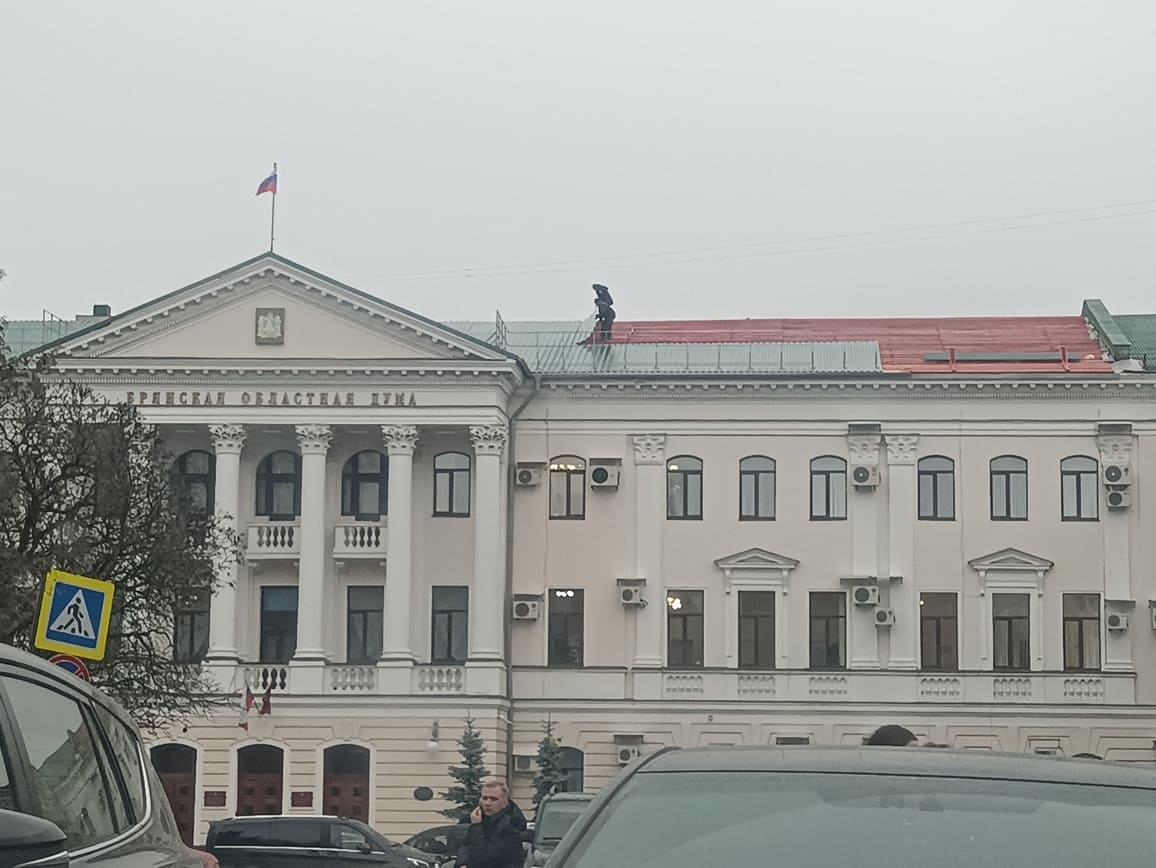 То ли Карлсоны, то ли аисты, то просто отчаянные мужики-коты, каждый минимум с 9-тью жизнями, перекрывают кровлю на монументальном здании Брянской областной Думы.