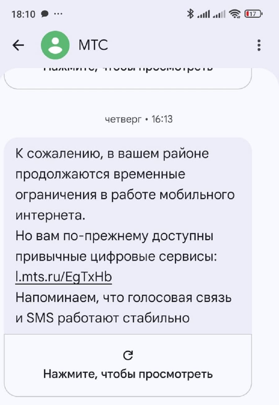 Хотя еще менее недели тот же МТС присылал журналисту Чернову другое совсем по содержанию СМС: “К сожалению, в вашем районе (каком именно “районе”, не уточнялось – Прим. Ред.) продолжаются временные ограничения в работе мобильного интернета”. А в качестве утешения в том коротком текстовом сообщении – как в 2000-е годы – говорилось о том, что “голосовая связь и SMS работают стабильно”. Что такого, позволившего вновь включить мобильный интернет, кардинально поменялось за 5 дней, в сотовом операторе не пояснили.