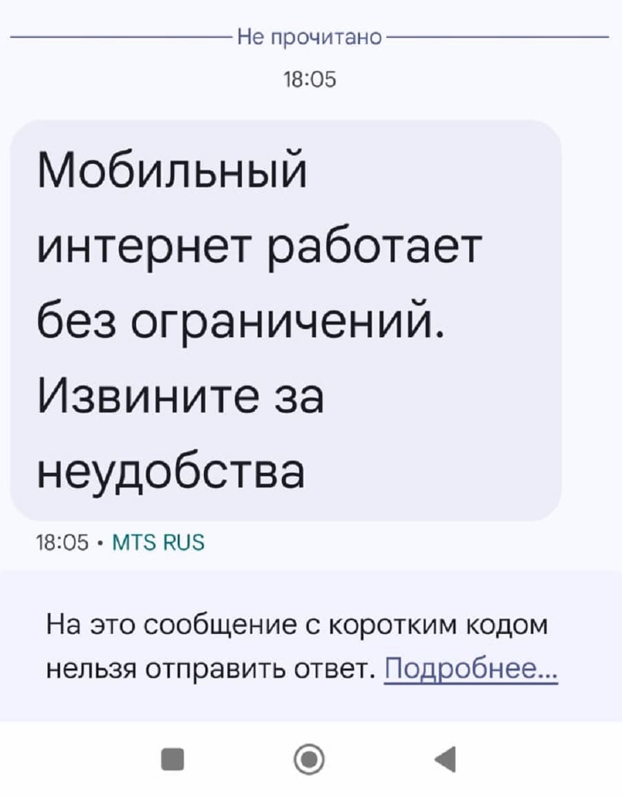“Мобильный интернет работает без ограничений. Извините за неудобства”.