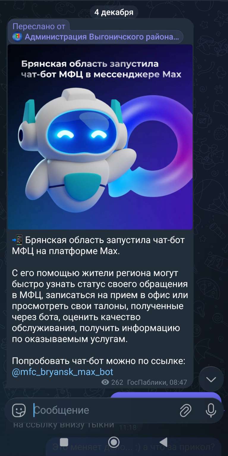 В официальном Телеграм-канале Выгоничской районной администрации Брянщины появилось и вскоре исчезло сообщение со ссылкой на “чат-бот МФЦ на платформе Max”. Все бы ничего, но она вела на другой, ссозданный накануне ТГ-канал “Богомаза в отставку”.
