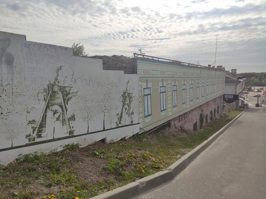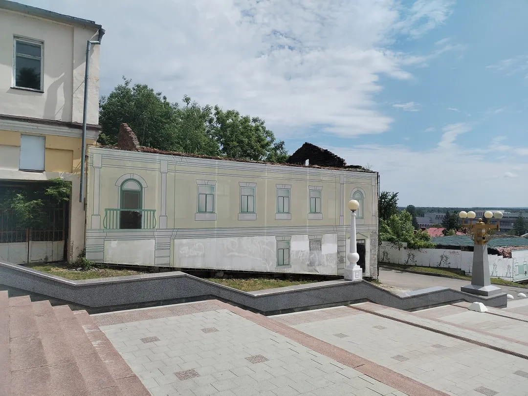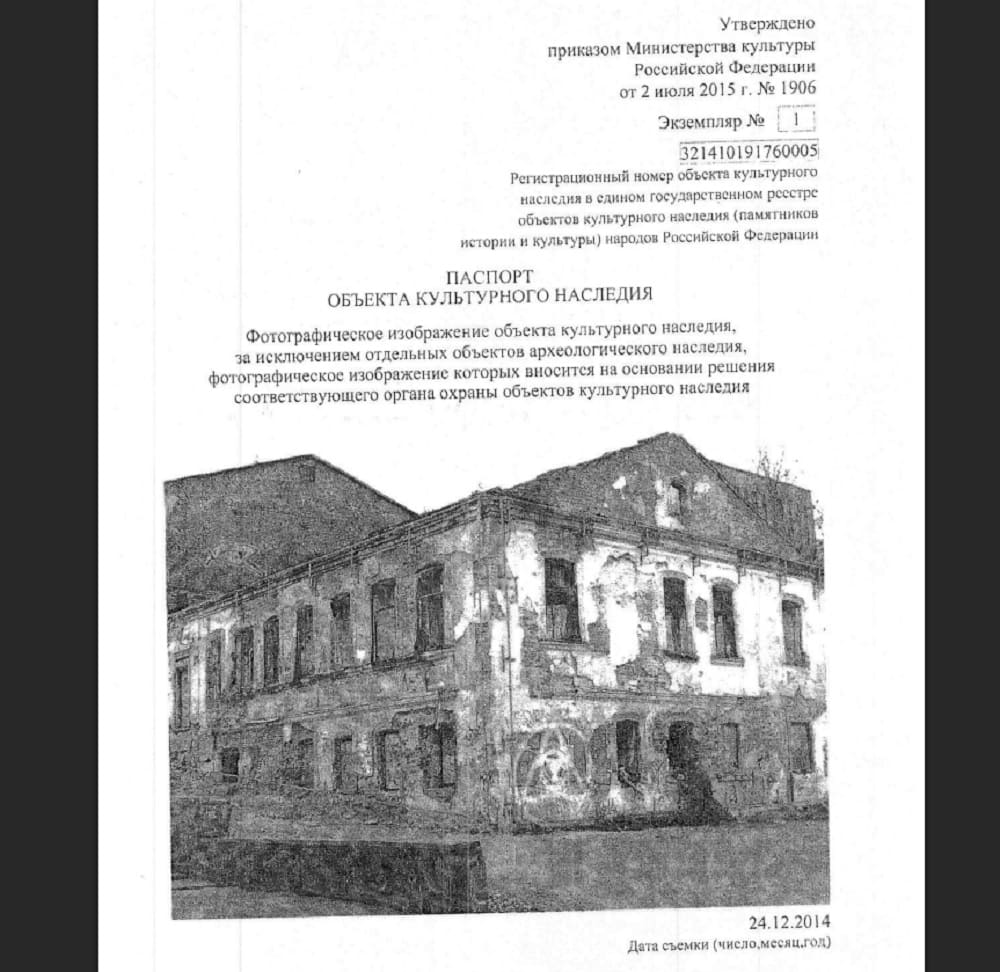 Но многое из того, что отражено в приказе, на самом деле уже не существует. Фасад затянут баннером с нарисованным изображением «правильного» здания, а за ним скрываются обнажённая кирпичная кладка с осыпавшейся штукатуркой и полуразрушенные стены. Возникает закономерный вопрос: не слишком ли поздно взят под охрану объект, который фактически уже утрачено».
