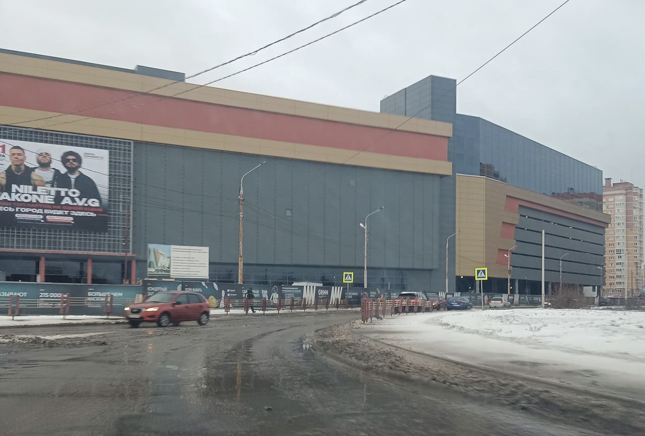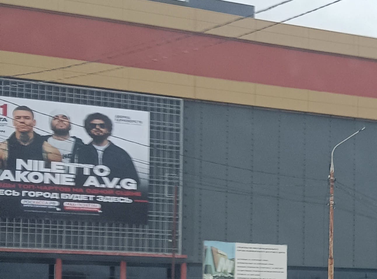 На “главной” боковой стене ТРЦ появился многометровый баннер с рекламой мартовского концерта “Звёзд топ-чартов на одной сцене: JAKONE, A.V.G, NILETTO”. Тех самых не шибко известных, как по нам-то артистов (18+), “чьи треки не один год не сходят с первых мест всевозможных хит парадов и топ-чартов” (так, смело заявлено в описании концерта на официальном сайте).