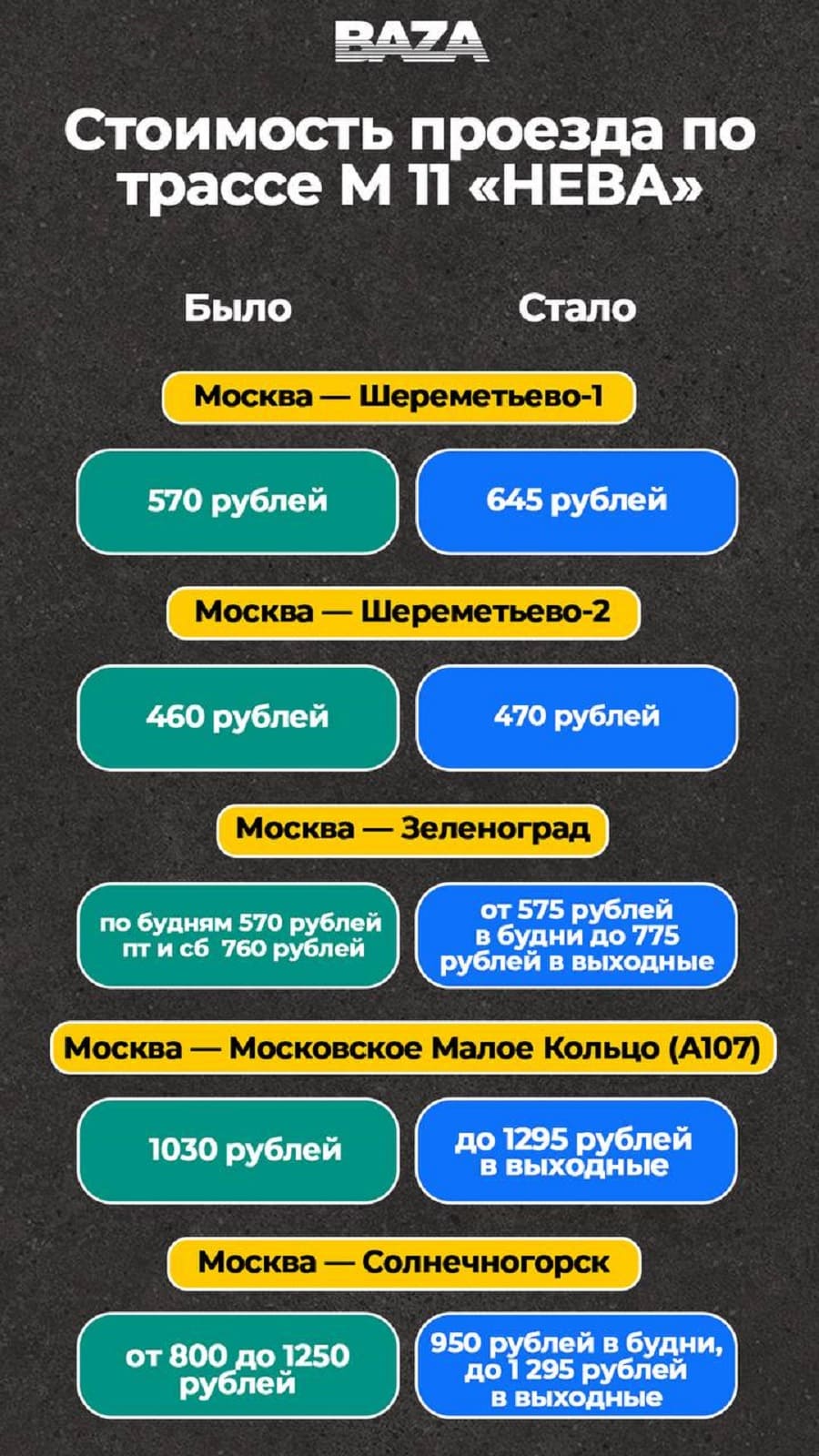 – Итак, тарифы станут выше на трассах: М‑4 «Дон», М‑12 «Восток», ЦКАД. На М‑11 «Нева» цены уже выросли с 12 января 2026 года. Так, например, дорога в аэропорт Шереметьево подорожала с 570 рублей до 645 рублей. Изменились тарифы и по другим направлениям – в Зеленоград, Солнечногорск и так далее. Подробнее в нашей графике, – рассказали коллеги. – По другим трассам новые тарифы пока не называют. Окончательное решение по увеличению платы будет принято после анализа экономических показателей, заявили в «Автодоре».