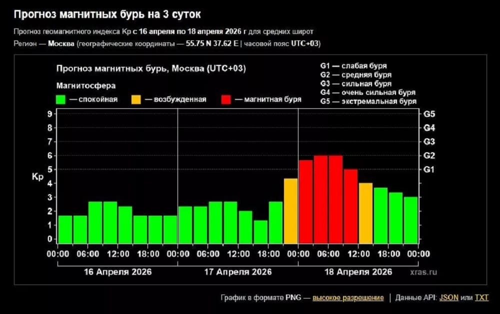 Пик магнитной бури силой 6 баллов придётся на первую половину дня 18 апреля — с 9 до 12 часов. Но уже после полудня буря начнёт заметно слабеть — окончательно утихнуть она должна будет к 16 часам субботы.