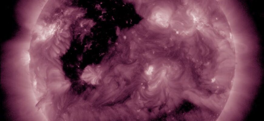 По данным астрофизиков, геомагнитный фон начнет повышаться с вечера пятницы, 17 апреля, и к 6 утра субботы перерастёт в космический шторм, достигнув уровня G2 (средняя магнитная буря). Его источником станет новая корональная дыра на «Звезде по имени Солнце» (на заглавном фото).