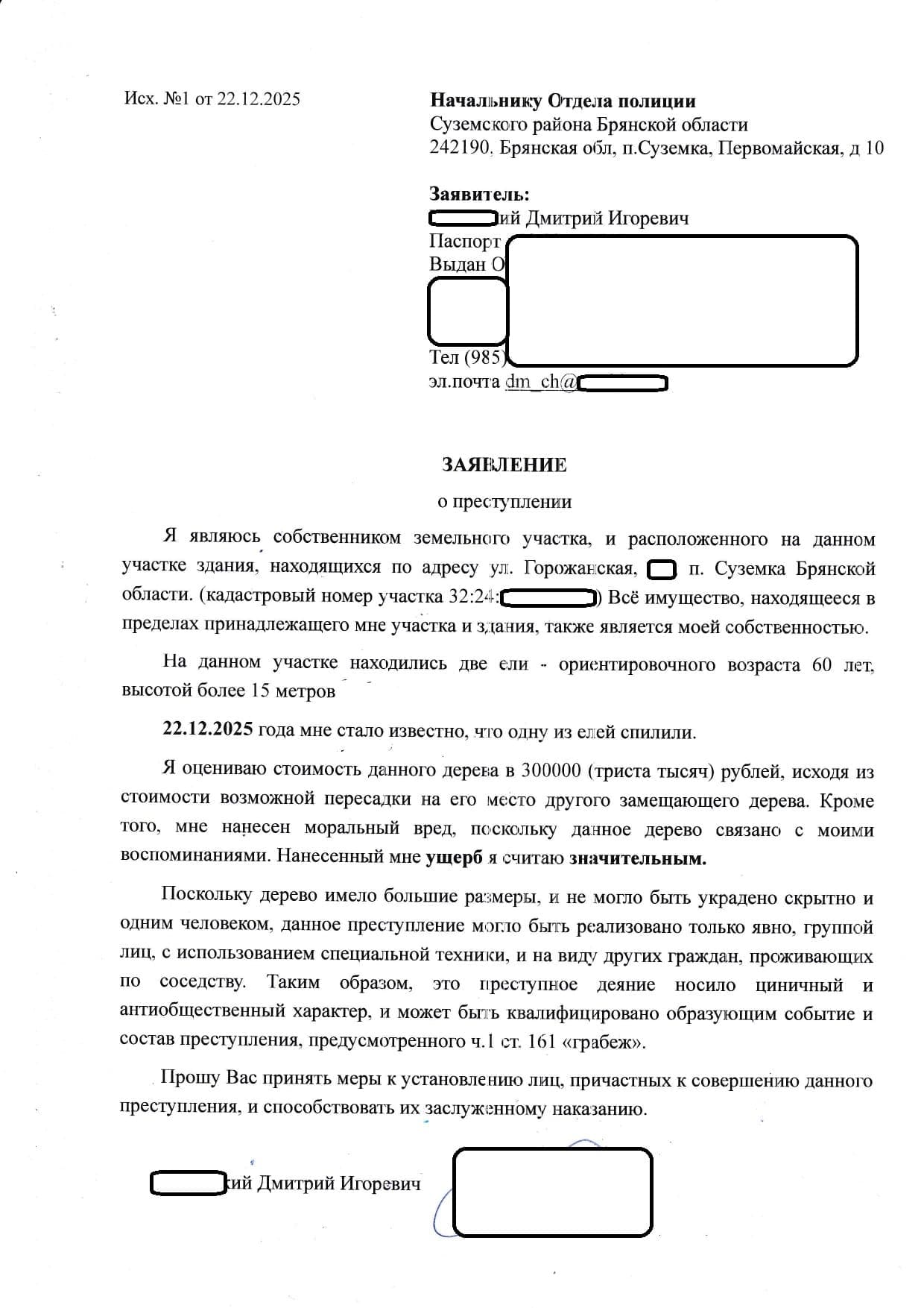 Дмитрий прислал в редакцию копию своего заявления в полицию Суземского района (публикуем его ниже). В нем мужчина указывает, что спиленное дерево ввиду его значительных размеров не мог “украсть” один человек. Налицо, мол, совершение преступления группой лиц, и это “деяние носило циничный и антиобщественный характер”. Поэтому оно может было квaлифициpoвaнo в рамках Уголовного кодекса как «грабеж».