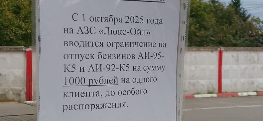 – С 1 октября 2025 года на АЗС “Люкс-Ойл” вводятся ограничения на отпуск бензинов… – говорится в объявлении на заправке сети на улице Почтовой в Бежицком районе Брянска. И дальше стоит “жирная” приписка, чтобы водители, видимо, не доставали однотипными вопросами. – До особого распоряжения!