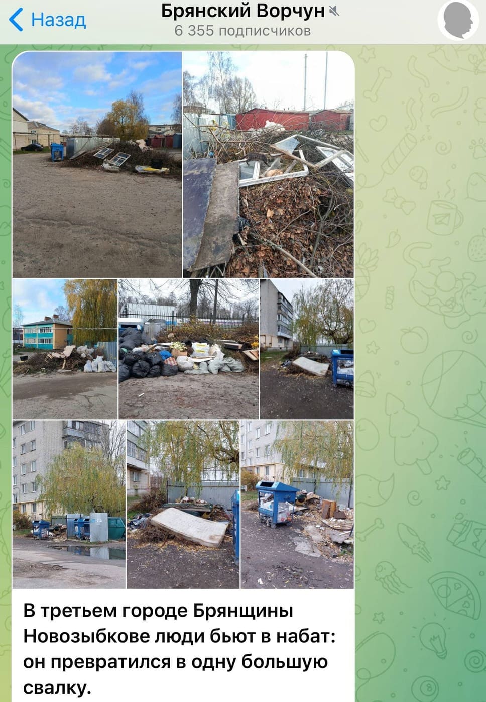 В воскресенье, 9 ноября, “Брянский ворчун” рассказал в своем одноименном Телеграм-канале о том, как в третьем городе Брянщины Новозыбкове люди бьют в набат. Он превратился в одну большую свалку. И то “заслуга” в том числе непродуктивного мэра товарища Юрлова. Он только и умеет, как говорят, руками красиво водить. Руководитель все-таки…