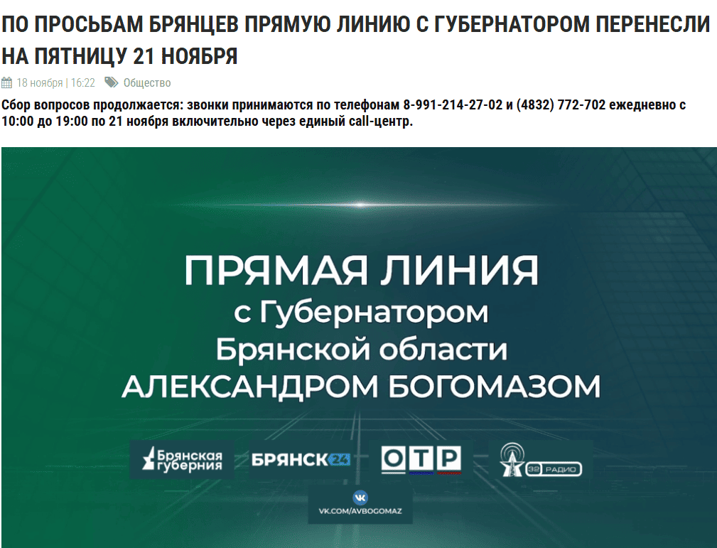 Брянский губернатор объявил в своем телеграм-канале о переносе прямой линии с самим собой на 21 ноября. Государственный телеканал региона “Брянская губерния” заявил, что сеанс коллективного общения с Александром Богомазом сдвинули на день вперёд “по просьбам брянцев”. Каких именно, правда, уточнять не стали.