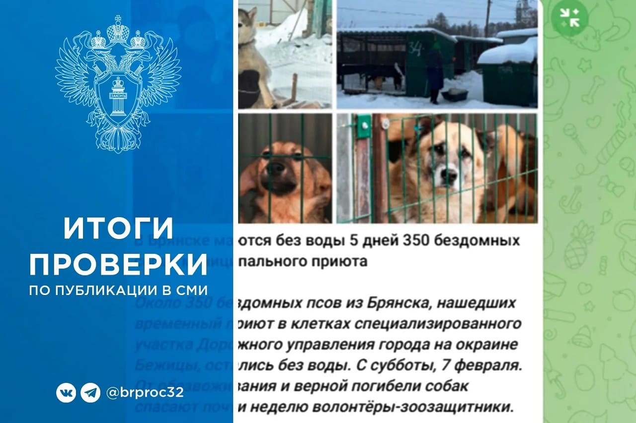 О проблеме «Брянский ворчун» рассказал единственным из СМИ 11 февраля в заметке «В Брянске маются без воды 5 дней 350 бездомных собак муниципального приюта» (позже уточнили: собак 380, — Прим. Ред.). В тот же день пресс-служба прокуратуры Брянской области сообщила, что надзорное ведомство проведёт прокурорскую обстоятельную проверку. Мы порадовались.