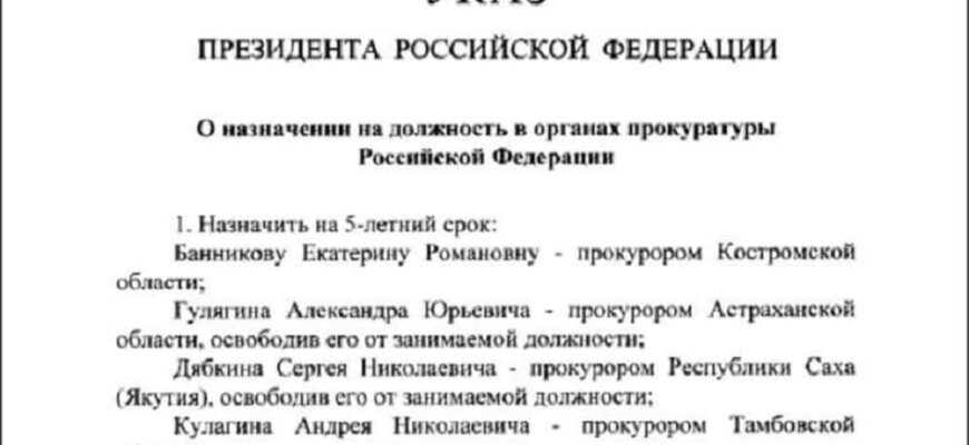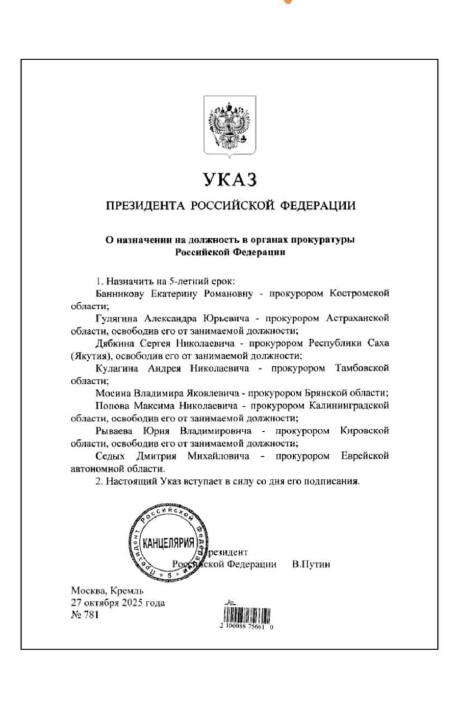Глава государства Владимир Путин подписал сегодня, 27 октября, президентский указ №781 о назначении прокуроров в ряд субъектов страны.