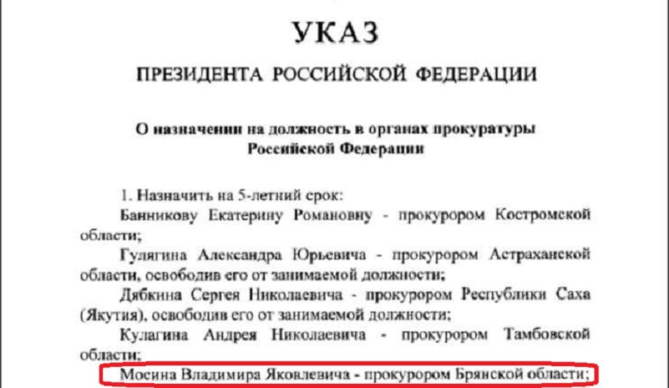 Брянцам в этой связи будет интересен старший советник юстиции Владимир Мосин – он стал прокурором Брянской области. Теперь уже официально, отныне точно – без домыслов и предположений.