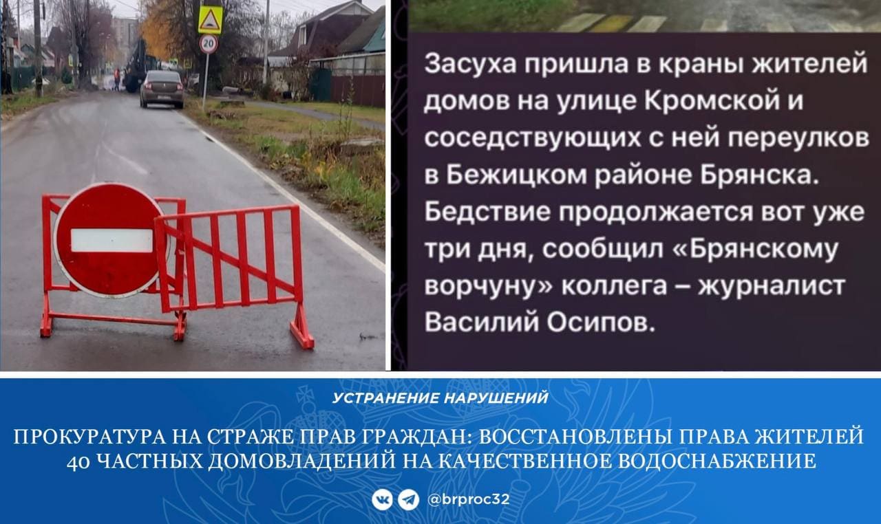 Прокуратура Бежицкого района города Брянска по сигналу телеграм-канала СМИ “Брянский ворчун” добилась восстановления права жителей 40 частных домовладений на качественное водоснабжение.