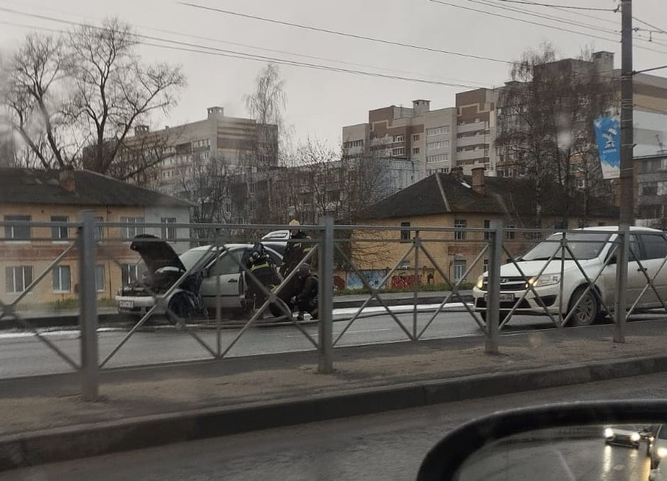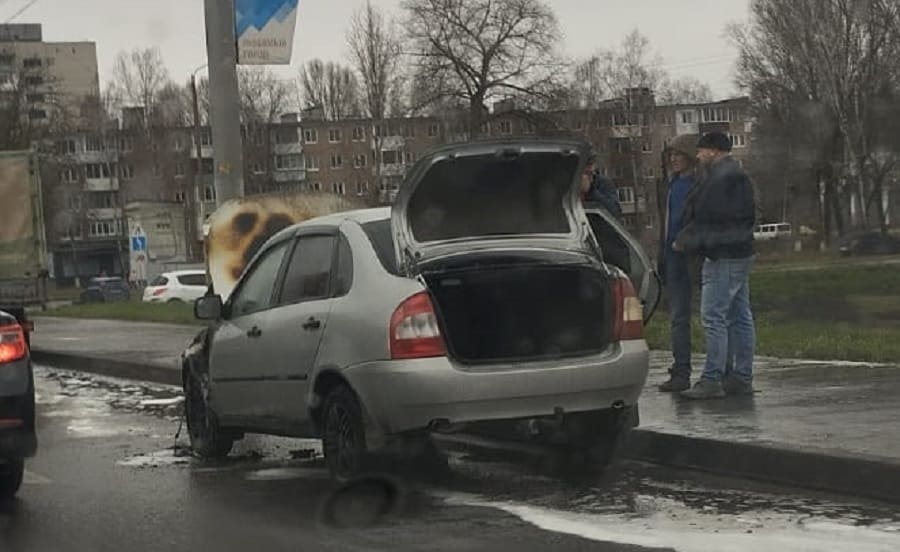 Горела серебристая “Лада Калина” старой модели. Возгорание возникло в моторном отсеке. Когда легковушка ехала в районе остановки общественного транспорта “Западная”. Водитель спешно припарковался у края правой полосы.