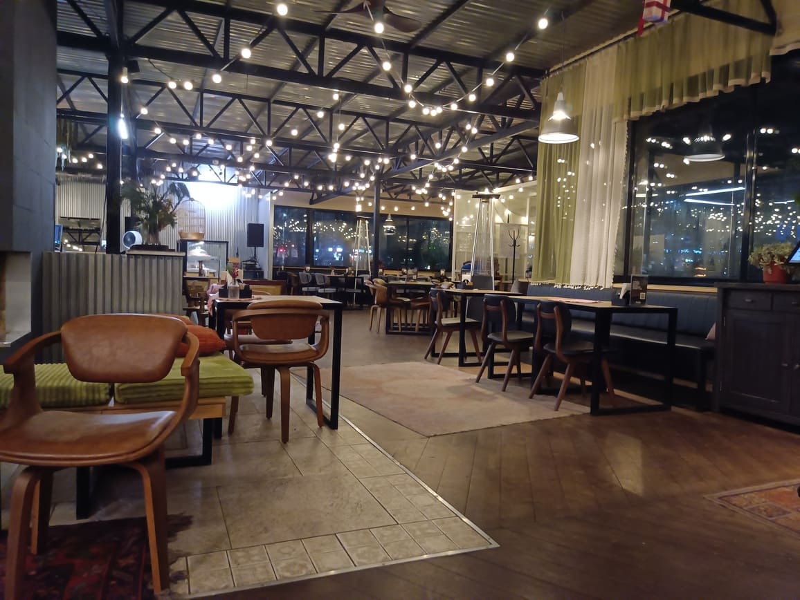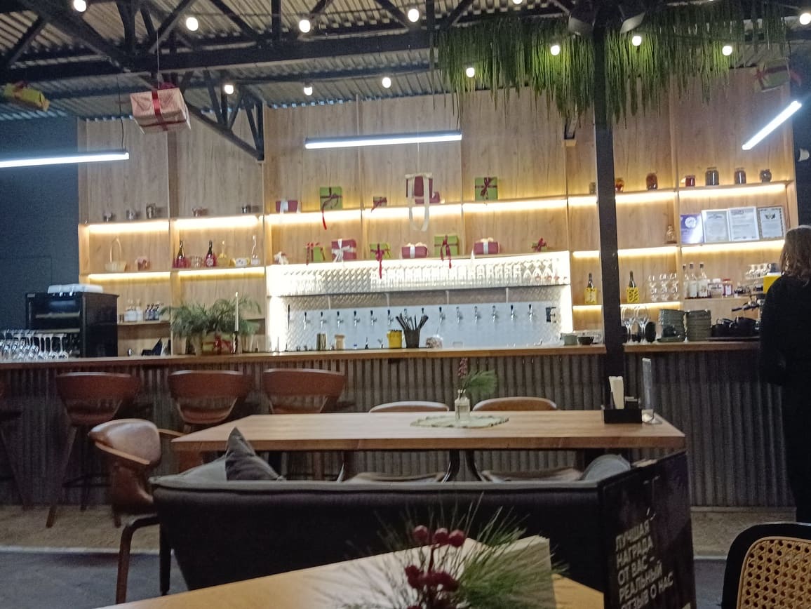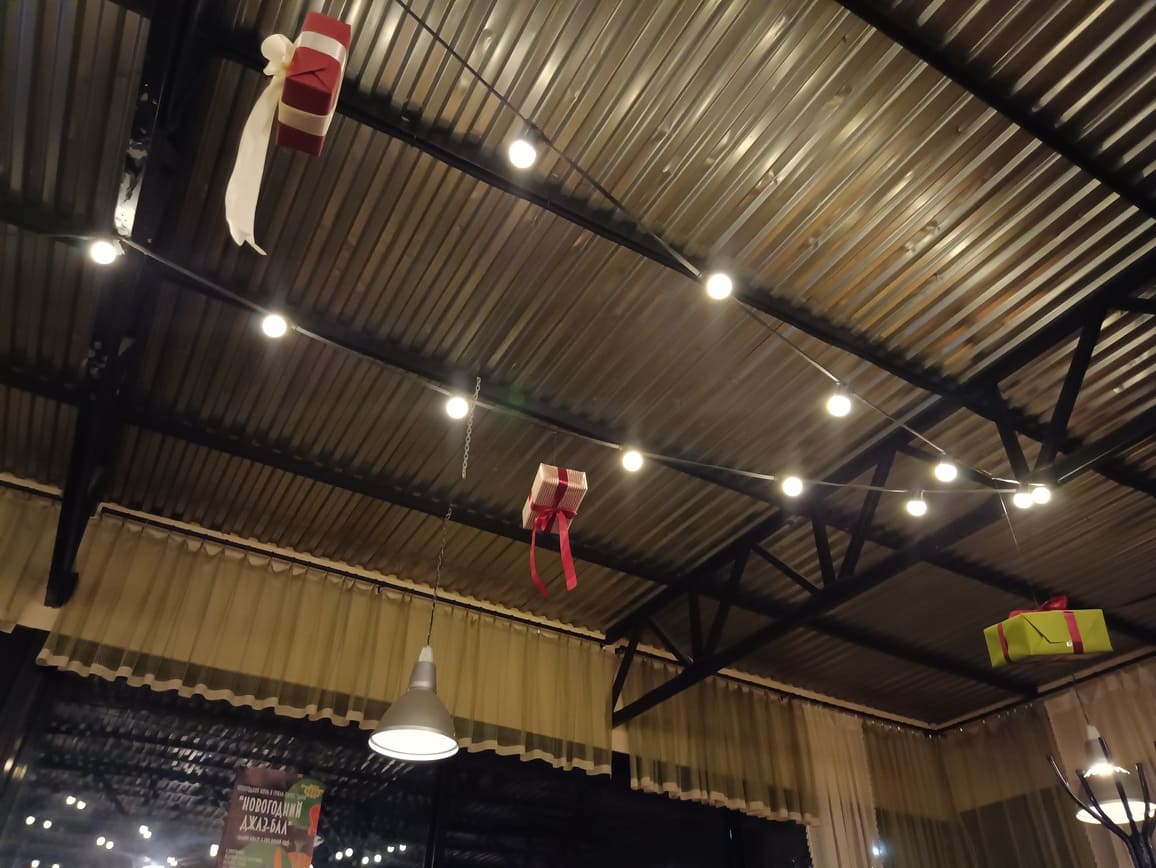 Под ребристой крышей из обычного профлиста развешаны разные прикольные шутки. В глубине зала, ближе к кухне располагается бар. Справа от него, за деревянным заборчиком, есть детский игровой уголок с сухим бассейном из сотен разноцветных шаров, столик для рисования и другие забавы. Можно приходить сюда с маленькими.