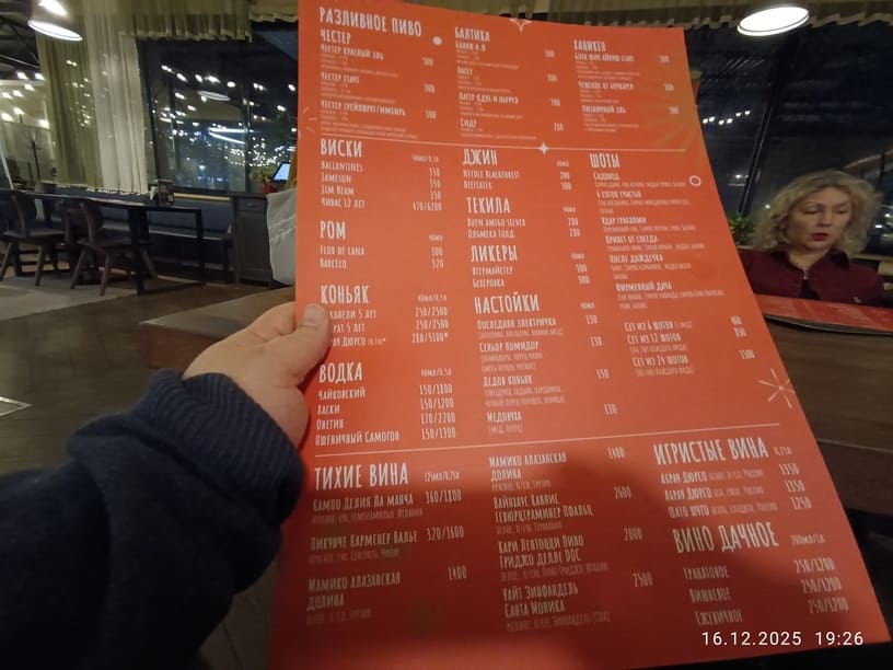Забегая вперёд, скажем, что Черновы всё равно выбрали многое из того, что и дома могли бы сами приготовить. На круг, как потом подсчитали, получилось 23 позиции. Вместе с бутылкой ординарного красного чилийского, 40-миллимитровым стаканом виски Jameson, маленьким бокалом фруктового (вишнёвого) вина, чайником ягодного чая, мороженным, тремя десертами (чизкейками), плошкой соуса и лимонадом.