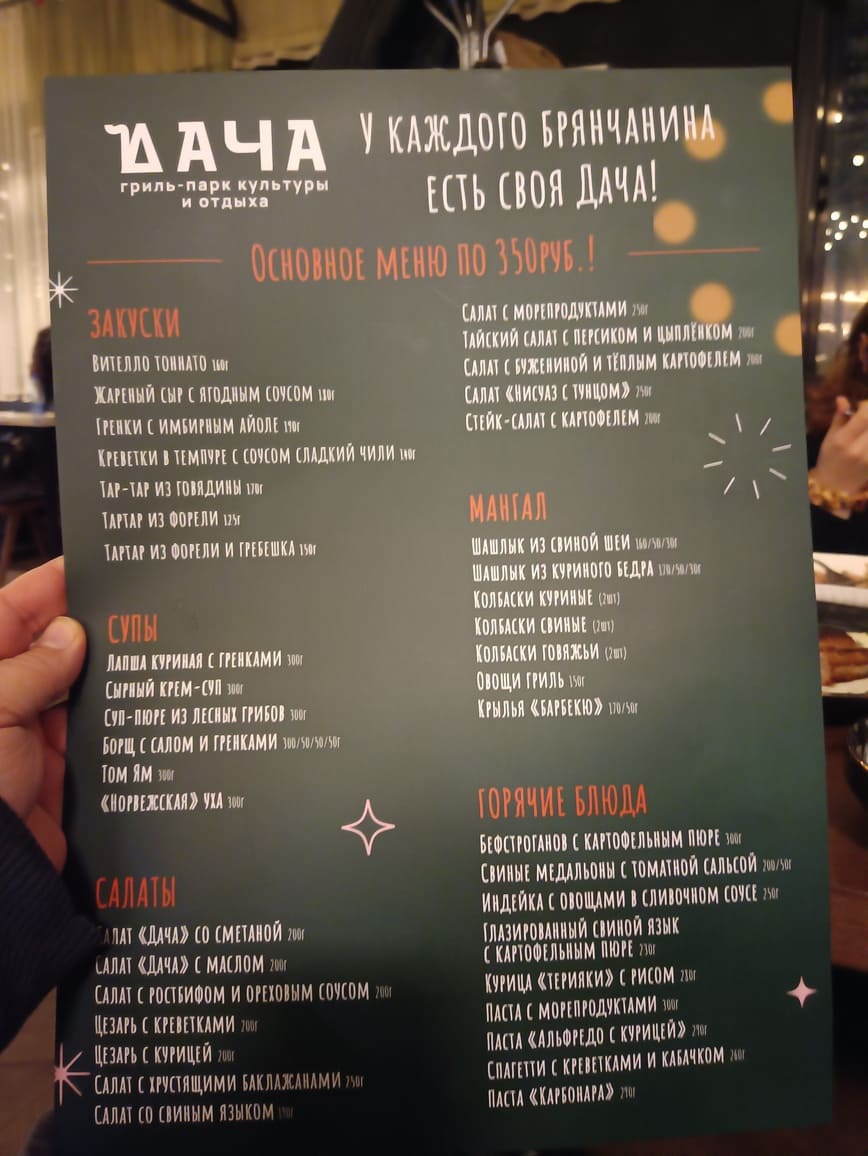 Гостевая концепция “Дачи” – значительная часть меню представлена блюдами по единой цене. Сейчас это 350 рублей за порцию (прежде было меньше). Не важно, будь то салат, горячее с гарниром, без оного или только один гарнир. Цена единая. Поэтому надо быть внимательным при выборе: горячее с гарниром или без него может выйти по одной стоимости.