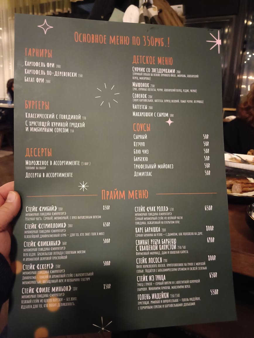 Эта “фишка” привлекает посетителей. Прежде всего, обманчивой дешевизной. Ведь разу хочется взять и то, и другое, и третье. Что в итоге выливается в нормальный по сумме чек. Есть также много блюд в меню, которые стоят дороже, чем 350 рублей. Хотя и не заоблачно.