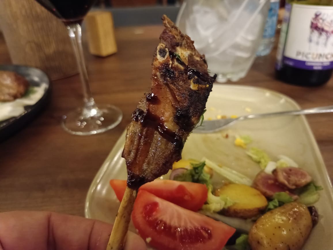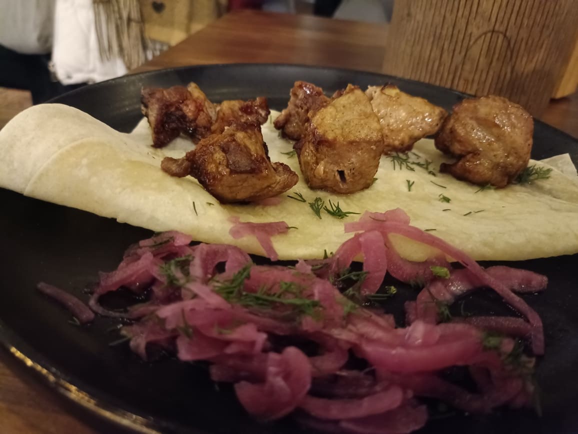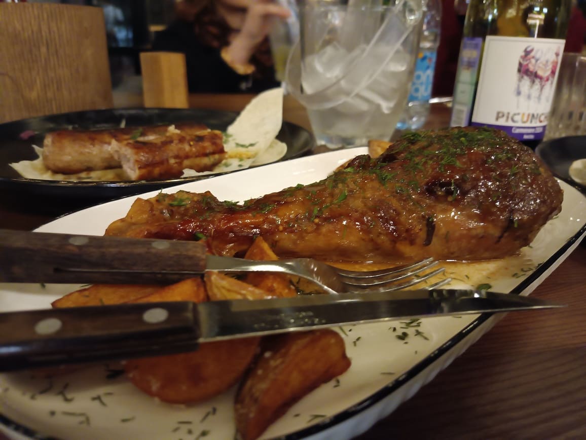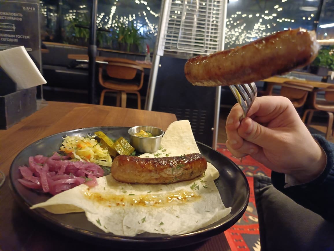 Колбаски описывать и тем более обсуждать нет никакого смысла. Они без яркого вкуса, пресные. И будто из магазина за углом. Свиной шашлык (несколько кусочков) и индюшиная голень (ну о-о-очень большая) были, наоборот, вкусны и нежны. Но уже лишние – чисто из-за того, что до них было много чего другого.