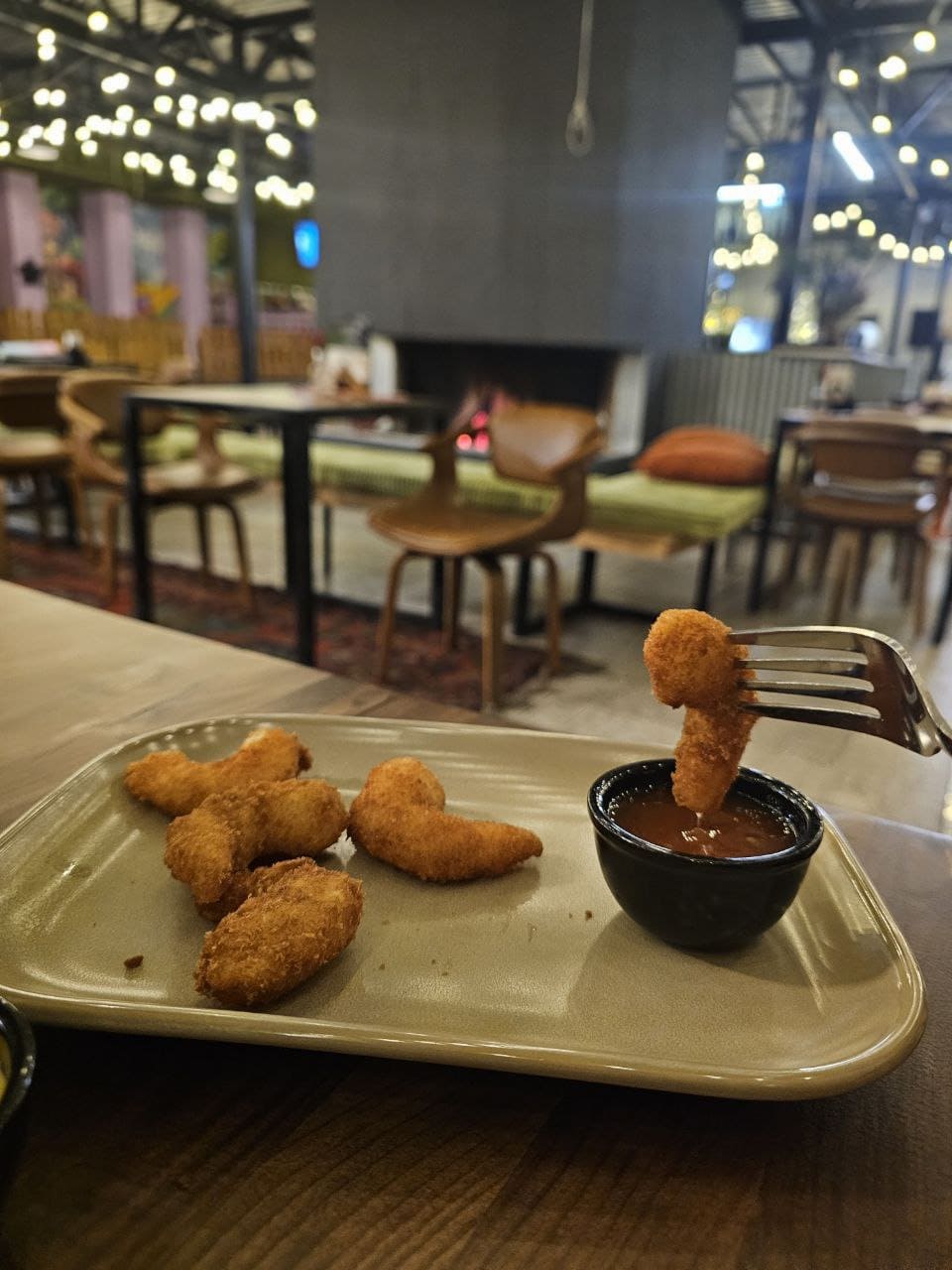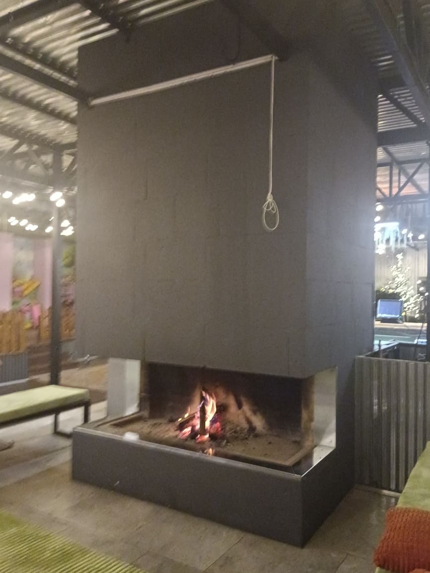 “Дачу”, занявшую просторный летний ангар без центрального отопления, отличает просторный и кажущийся при входе с улицы несколько мрачноватым зал. В его центре остров из прозрачных холодильников с кондитеркой и десертами (о них ниже). Далее высится большой камин. Над ним свёрнутый экран кинопроектора, с которого свисает “верёвка с петлей”. Б-р-р-р…