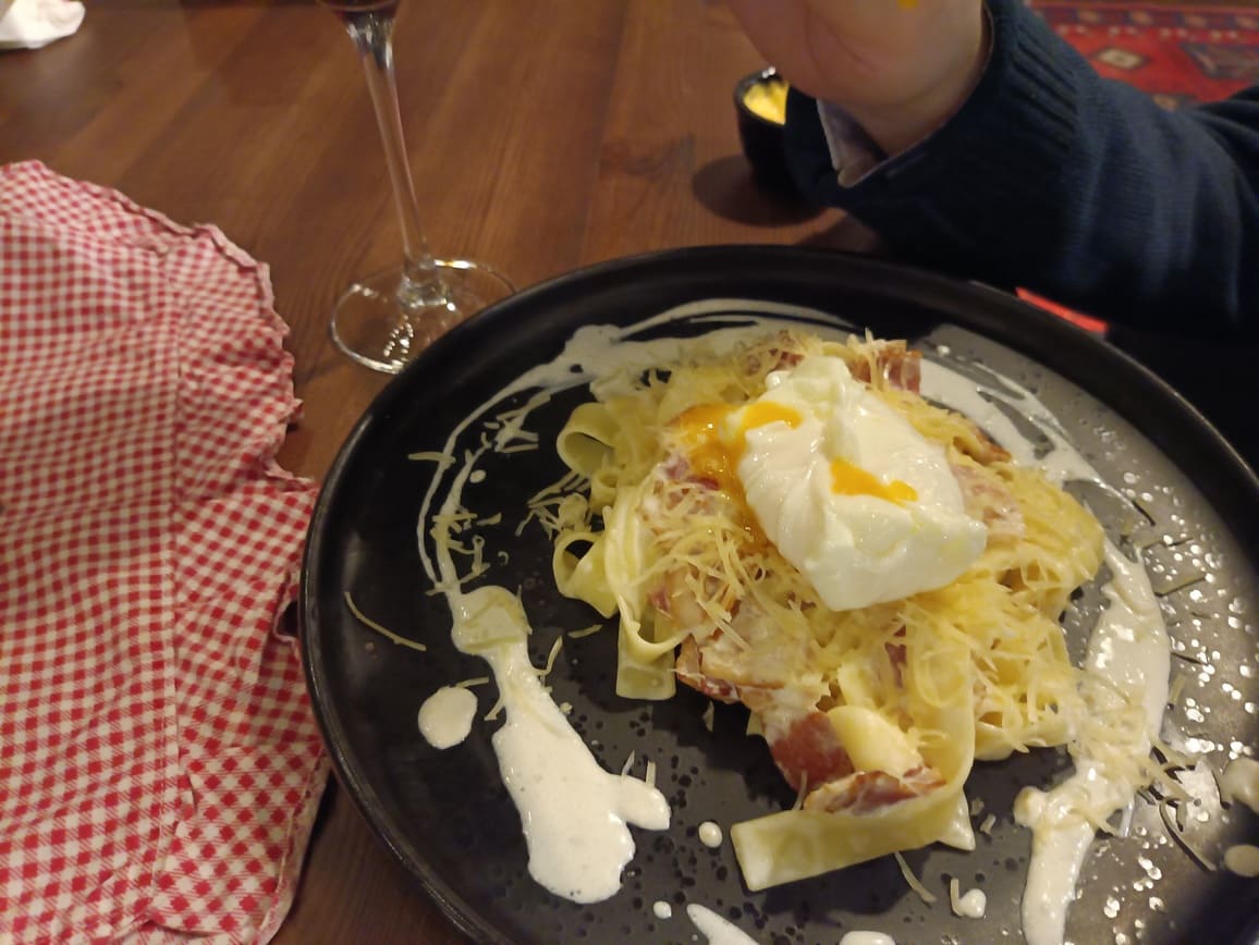 Девочки Черновы заказали два вида пасты – Карбонару и Альфредо с курицей. Показалось, что первую на “Даче” делают не по классическому рецепту – со сливками, то есть “адаптированную” для трудящихся. Тоже имеет право на существование.