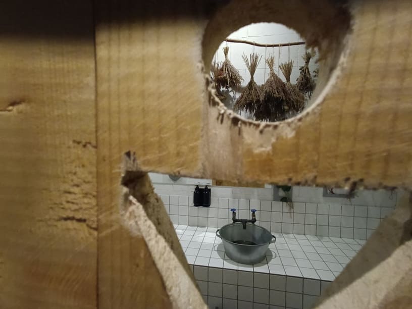 Туалеты находятся напротив череды рукомойников, которые стилизованы под металлические тазы, выставленные как бы посреди деревенской улицы. Но рядом с ними наличествуют хорошее мыло, приятный лосьон для рук, бумажные полотенца и даже лесенки-приступки для самых маленьких “дачников”.