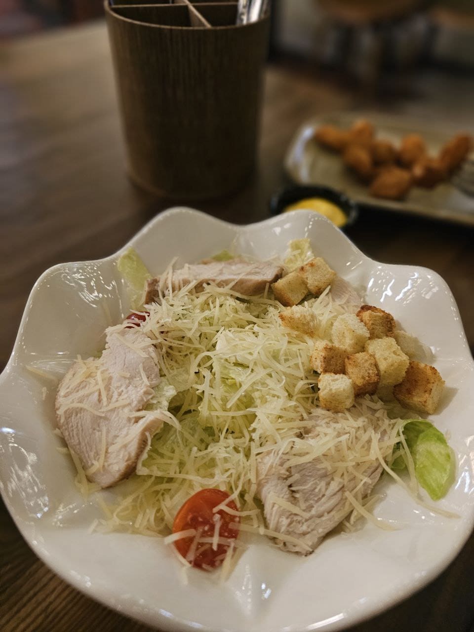 На “разминку” были выбраны картофель-фри (куда же без него представителям молодого поколения) и несколько салатов: Нисуаз с тунцом классический, Вителло тоннато (Vitello Tonnato), Салат с хрустящими баклажанами и Цезарь с курицей. Последний младшая из Черновых заказывает абсолютно в любом кафе-ресторане – обязательный атрибут с последующим сравнением того, что вкушалось ранее.
