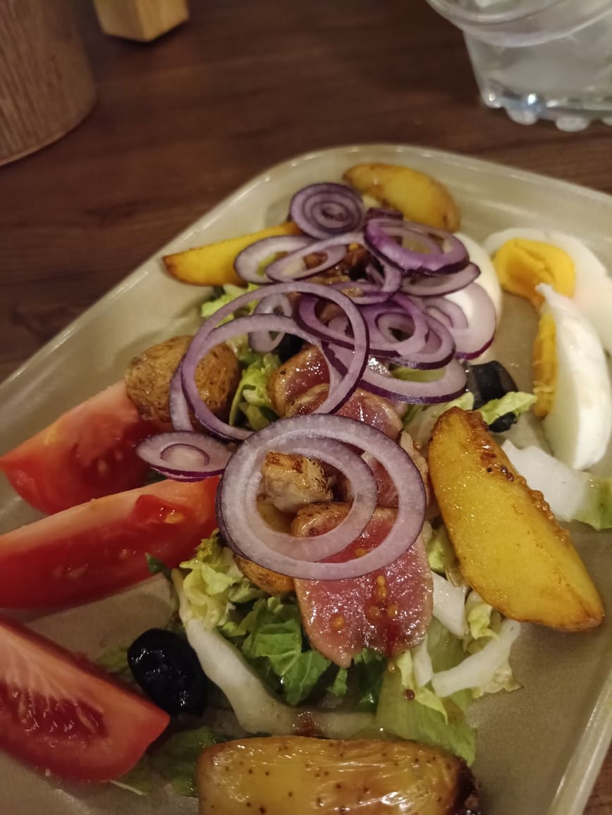 Нисуаз с тунцом – это обычно сытное и сбалансированное блюдо, за счёт клетчатки и большой составляющей «правильных» углеводов и белка. На “Даче” он весьма недурственный, а порция большая. Но тунца можно было бы и побольше положить, впрочем, а картошки – чуток меньше.