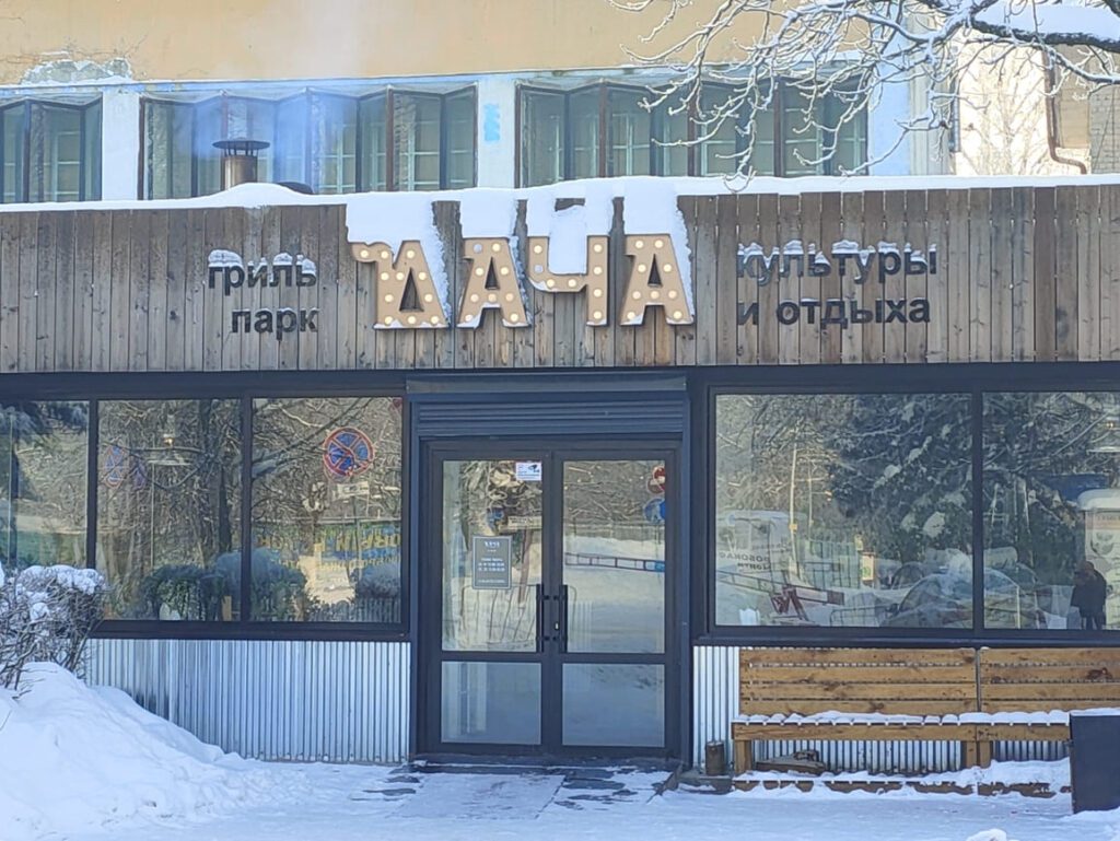 Само заведение гриль-кафе “Дача” с главной улицы не сильно заметно. Надо знать, где оно находится, чтобы безошибочно найти с первого раза входную дверь. Кто не знает: смотрите с улицы Дуки на Курган Бессмертия, подходите к памятнику-стеле «Город воинской славы» и поворачиваетесь направо, выдерживая угол в 90 градусов. А затем ещё метров 100 крадётесь по тёмной-претёмной аллее Центрального парка культуры и отдыха им. 1000-летия Брянска. Из-за него у кафе есть “второе”, ироничное название, а именно “гриль-парк культуры и отдыха”.