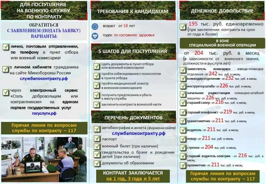 В зоне проведения специальной военной операции требуются стрелки, пулеметчики, радисты, гранатометчики, водители-электрики, телефонисты и саперы, инструкторы штаба и командиры отделений. Кандидат должен быть совершеннолетним и годным к военной службе в непростых боевых условиях – физически и морально.
