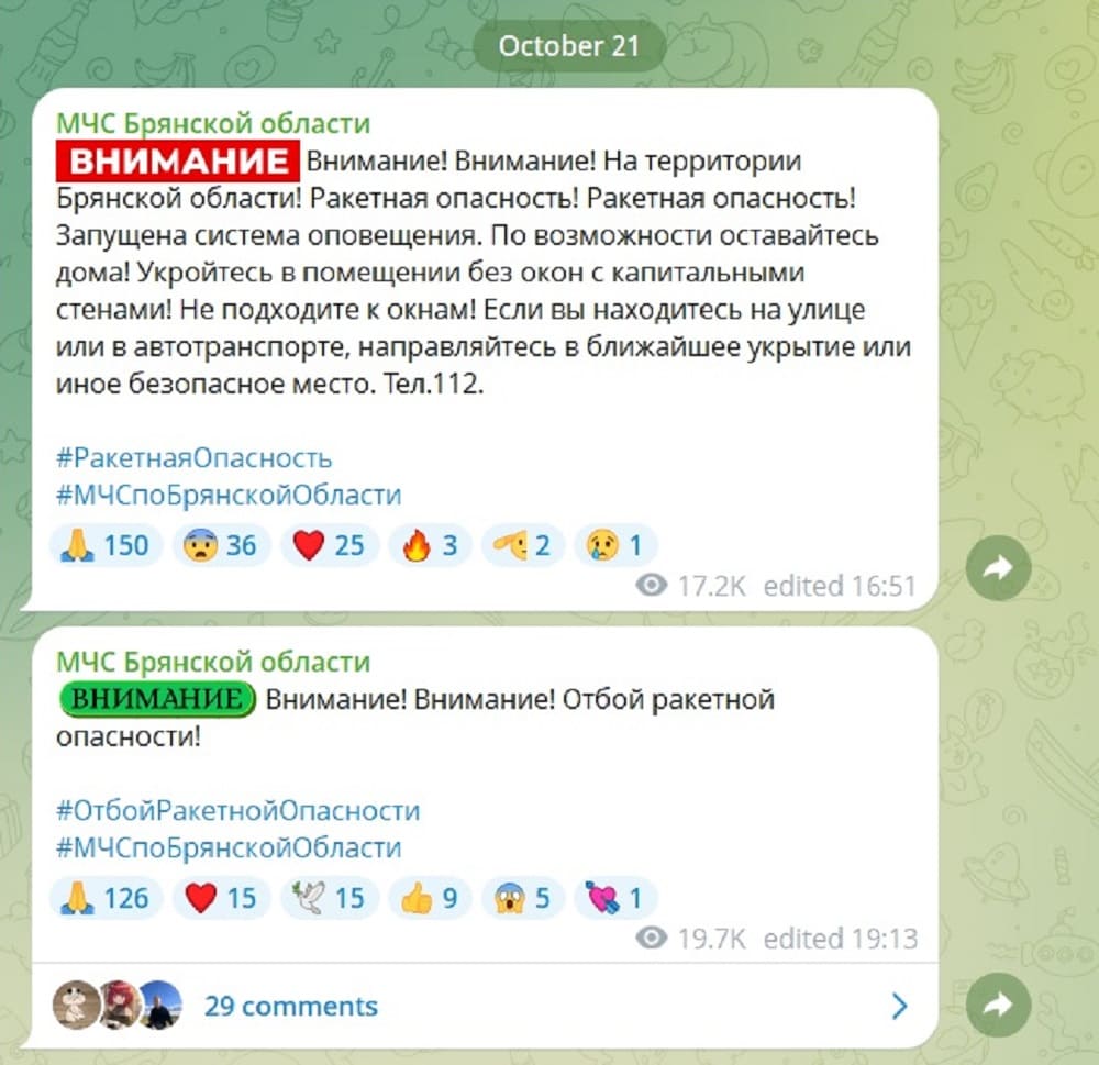 Тем временем губернатор Брянской области Александр Богомаз ничего не сообщал о возможных атаках Украины 21 октября по региону теми или иными ракетами. Он лишь повторил сообщение регионального оперштаба о ракетной опасности и затем – об ее отмене, а так же рассказал об очередной массированной атаке украинских беспилотников. Их, по словам главы региона, сбили за вечер 21 октября 57 штук. В результате этой воздушной атаки никто не пострадал, пояснил Богомаз.